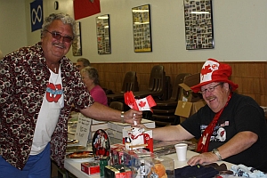 In the evening things really began to heat up, literally and figuratively. Though clouds had treated to spoil the fun as the day began, by late afternoon the sun was hot and strong. A clown on stilts welcomed everyone and was a super hit as he provided balloon art to the enchanted flock of children who followed his every move. There was no charge for the day and the organizers were very liberal with their gifts of Canada pins, stick-on tattoos, flags, and red maple leaf trinkets that blinked long and bright even when the sun disappeared. The silent auction table was none too shabby either, with a multitude of gifts that the G.B.A.D.C. purchased for the occasion.